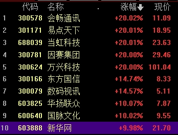 當虹科技、因賽集團、萬興科技、新華網(wǎng)(21.700, 0.00, 0.00%)等走強。