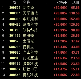 中際旭創(chuàng)、天孚通信、太辰光(37.620, 0.00, 0.00%)、源杰科技等多股活躍。