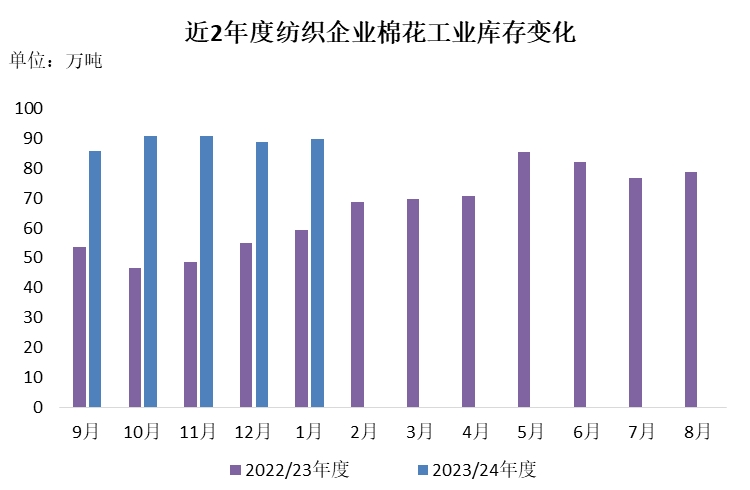 紡織品市場延續(xù)回暖態(tài)勢,紗線出貨量價齊升,企業(yè)適量采購原料,皮棉庫存穩(wěn)中略增。截至1月31日,紡織企業(yè)在庫棉花工業(yè)庫存量為89.69萬噸,環(huán)比增加1.03萬噸,同比增加30.37萬噸。其中:30%的企業(yè)減少棉花庫存,36%增加庫存,34%基本保持不變。