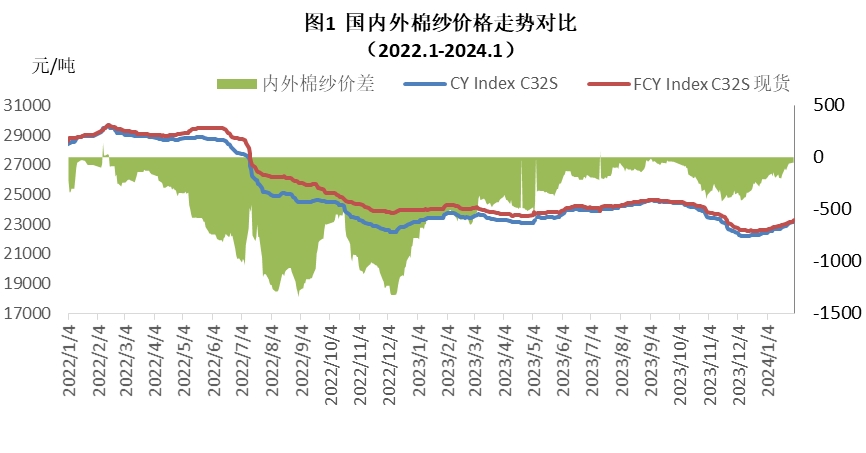 1月,內外棉紗價格均上漲,國產(chǎn)32支純棉紗月均價為22765元/噸,環(huán)比上漲538元/噸,漲幅2.4%,同比下跌586元/噸,跌幅2.5%;進口32支純棉紗1月均價22910元/噸,環(huán)比上漲321元/噸,漲幅1.4%,同比下跌了1077元/噸,跌幅4.5%。