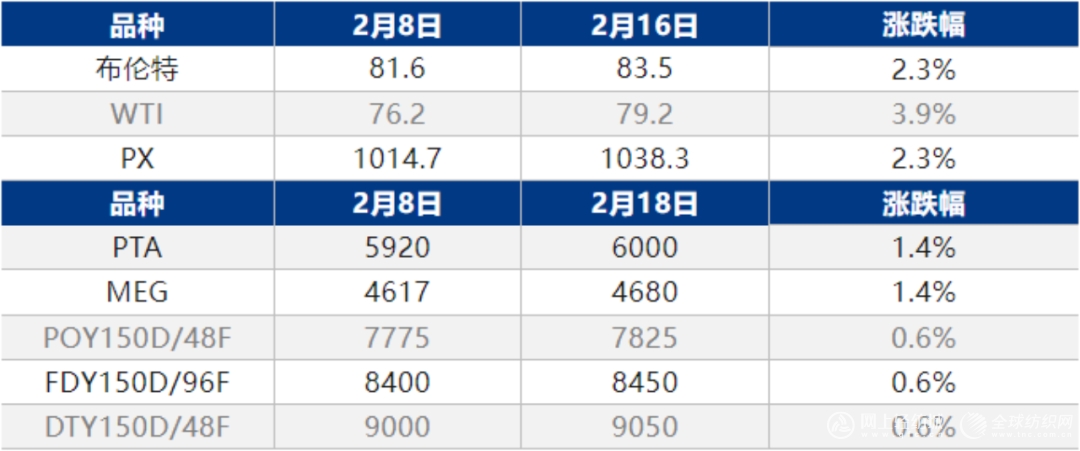 春節(jié)假期,國際原油價格出現(xiàn)了普遍上漲,布倫特原油期貨9天時間上漲了4.02美元,漲幅為5.42%,紐約原油期貨上漲了3.98美元,漲幅為5%。而在原油的帶動下,作為PTA原料的PX外盤價格也從1020美元上漲到了1038美元,漲幅為1.8%。成本端支撐下,滌綸長絲節(jié)后市場商談重心同步上揚??紤]到下游加彈、織造廠商尚未完全復(fù)工復(fù)產(chǎn),滌綸長絲廠商拉漲力度有限,漲幅遠低于原料端。