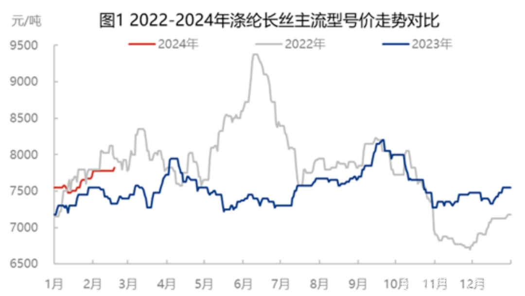 地緣政治危機延續(xù),假期油價震蕩上揚,布倫特原油由節(jié)前81.63漲至83.47美元/桶,WTU漲幅3.9%,PX漲幅高達2.33%。節(jié)前滌綸長絲廠商庫存處于相對低位,且春節(jié)前后滌綸長絲行業(yè)多套裝置停車檢修,企業(yè)庫存壓力不大,因此節(jié)后成本壓力增大,滌綸長絲廠商也跟隨原料漲勢,2月15日-2月18日多數(shù)企業(yè)報價陸續(xù)上調(diào)50-150元/噸,優(yōu)惠不斷收窄,低端商談減少,市場成交重心上揚。然對比2022年來看,目前滌綸長絲成交重心仍處于歷史偏低水平。