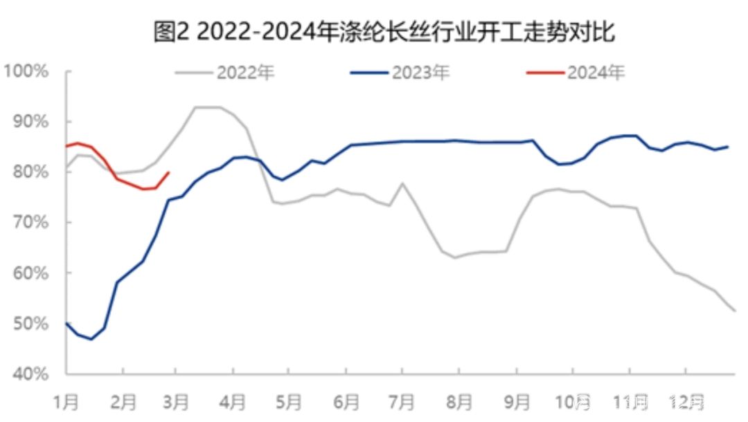 春節(jié)前滌綸長絲多套裝置減停,行業(yè)產(chǎn)能利用率降至77%附近,節(jié)后部分裝置陸續(xù)重啟,另部分裝置停車檢修,滌綸長絲產(chǎn)能利用率逐漸提升至80%附近,相較于節(jié)前產(chǎn)能利用率提升3.4%。節(jié)后滌綸長絲產(chǎn)能利用率提升迅速,然目前行業(yè)整體產(chǎn)能利用率仍處于相對低位,遠低于疫情爆發(fā)前行業(yè)平均水平。據(jù)數(shù)據(jù)統(tǒng)計,2月下旬及3月份仍有裝置減停計劃,而前期重啟裝置負荷提升緩慢,因此2月滌綸長絲平均產(chǎn)能利用率8成以下。