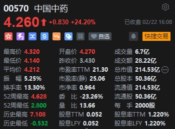 中醫(yī)藥股漲幅居前 ,中國中藥全天漲超24%。2月21日晚間,中國中藥發(fā)布公告,國藥集團建議透過計劃安排的方式,以每股4.6港元現(xiàn)金的價格將中國中藥私有化。國藥集團的報價較中國中藥最新收盤價溢價34.11%,國藥集團私有化建議的總代價約為154.5億港元。中國中藥已向香港聯(lián)交所申請自2月22日上午九時正起恢復(fù)股份買賣。