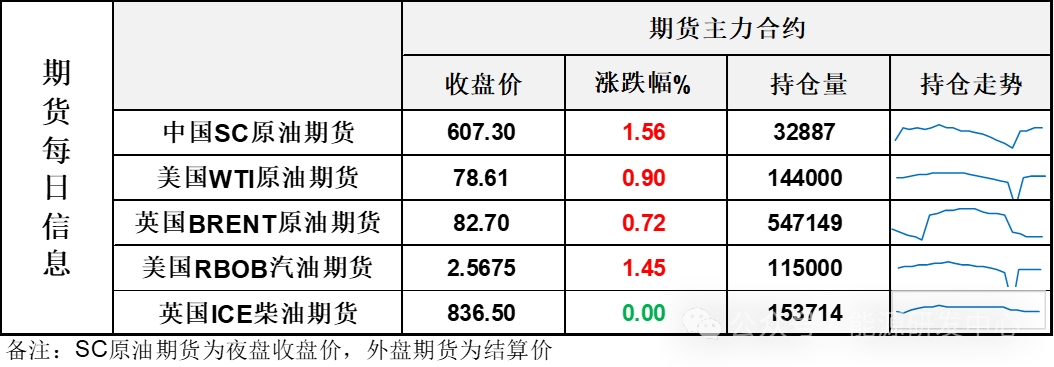 【1】WTI主力原油期貨收漲0.7美元,漲幅0.9%,報78.61美元/桶;布倫特主力原油期貨收漲0.59美元,漲幅0.72%,報82.7美元/桶;INE原油期貨收漲1.56%,報607.3元。