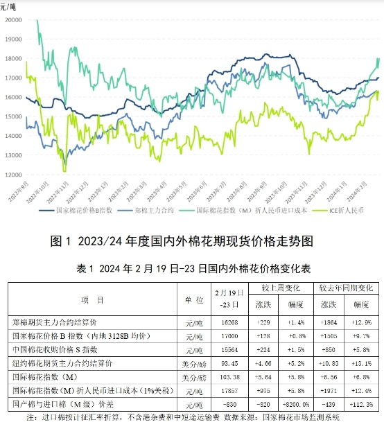 本周(2024年2月19日-23日)棉花期現(xiàn)貨價格均上漲,且基差擴大(圖1)。代表內(nèi)地標準級皮棉市場價格的國家棉花價格B指數(shù)均價17000元/噸,較前周上漲128元/噸,漲幅0.8%。代表進口棉中國主港到岸均價的國際棉花指數(shù)(M)均價103.38美分/磅,較前周上漲5.64美分/磅,漲幅5.8%;折人民幣進口成本17857元/噸(按1%關(guān)稅計算,不含港雜和運費),較前周上漲975元/噸,漲幅5.8%。2月19日-23日,鄭州棉花期貨主力合約結(jié)算均價16268元/噸,較前周上漲229元/噸,漲幅1.4%。常規(guī)外紗高于國產(chǎn)紗409元/噸,滌綸短纖價格上漲83元/噸至7385元/噸。紐約棉花期貨主力合約結(jié)算均價93.45美分/磅,較前周上漲4.66美分/磅,漲幅5.2%。