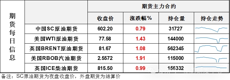 【1】WTI主力原油期貨收漲1.09美元,漲幅1.43%,報77.58美元/桶;布倫特主力原油期貨收漲0.87美元,漲幅1.08%,報81.67美元/桶;INE原油期貨收漲0.79%,報602.2元。