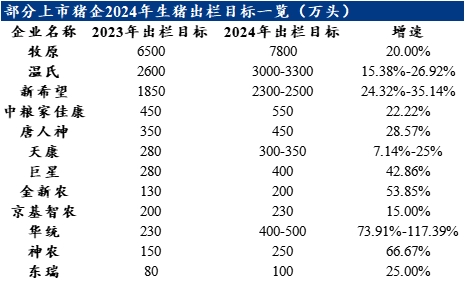 表1 部分上市豬企2024年生豬出欄目標(biāo)一覽