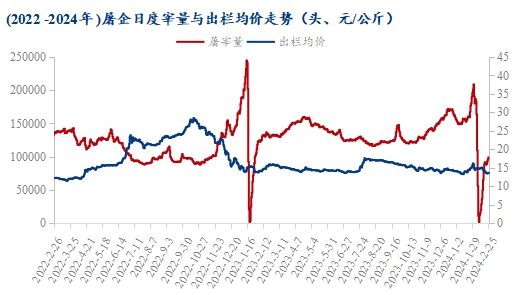 圖2 2022-2024年屠企日度宰量與出欄均價走勢