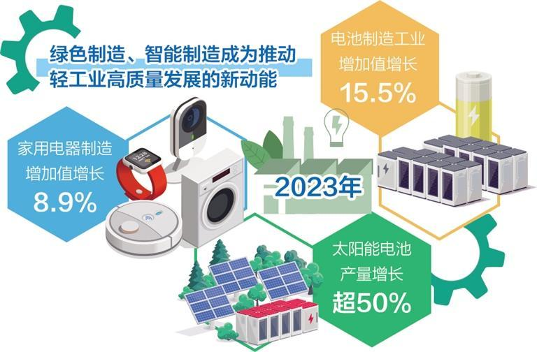 從行業(yè)來看,以太陽能電池、家用電器等為代表的輕工綠色制造、智能制造行業(yè)快速成長,成為推動輕工業(yè)高質(zhì)量發(fā)展的新動能。去年,太陽能電池、家用洗衣機(jī)、家用冷柜、電冰箱、空調(diào)等產(chǎn)品產(chǎn)量保持兩位數(shù)增長,其中太陽能電池產(chǎn)量增長超50%。電池制造工業(yè)增加值增長15.5%、家用電器制造增加值增長8.9%。