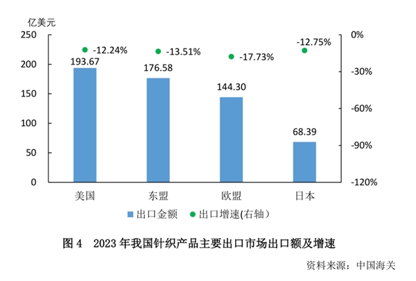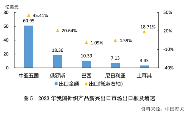 從出口市場來看,我國針織產(chǎn)品的出口結(jié)構(gòu)持續(xù)調(diào)整,貿(mào)易市場呈多元化發(fā)展。2023年我國針織產(chǎn)品對美國、東盟、歐盟、日本出口同比分別下降12.24%、13.51%、17.73%和12.75%。同期我國對中亞、中東、俄羅斯等國家和地區(qū)出口表現(xiàn)良好。2023年我國針織產(chǎn)品對中亞五國出口同比增長45.41%;對俄羅斯出口同比增長20.64%;對土耳其出口同比增長18.71%。此外,對尼日利亞、喀麥隆、巴西等國家出口也實現(xiàn)較好增長。