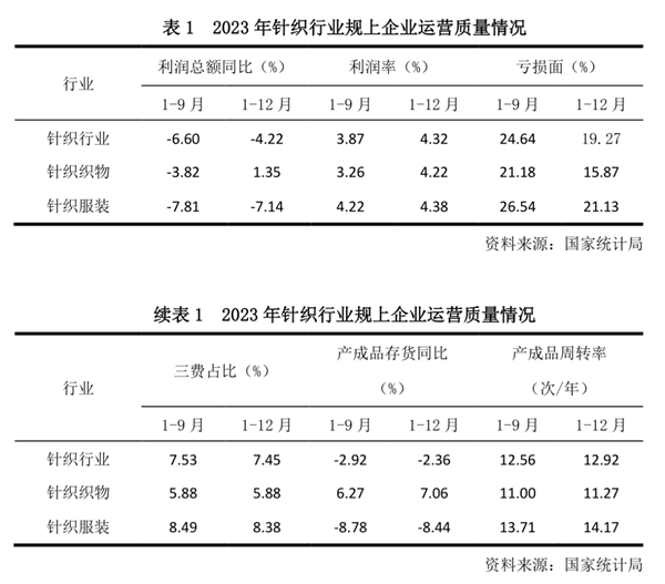 根據(jù)國家統(tǒng)計局數(shù)據(jù),2023年針織行業(yè)規(guī)上企業(yè)利潤總額同比下降4.22%,降幅較2023年前三季度收窄2.38個百分點,較2022年收窄6.59個百分點。其中針織織物利潤總額同比增長1.35%,實現(xiàn)增速由負轉(zhuǎn)正;針織服裝利潤總額同比下降7.14%。