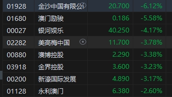 濠賭股全天萎靡,金沙中國(guó)跌超6%。高盛發(fā)表報(bào)告指出,澳門2月份賭收185億澳門元,為疫情前水平的70%,相對(duì)于1月及去年12月為78%及81%明顯回落,似乎是受累于春節(jié)假期后放緩幅度超出預(yù)期。日均賭收由2月份的首兩周約7.15億澳門元,回落至過(guò)去兩周的5.43億澳門元,返回去年底水平。此外,該行提及澳門每日入境旅客量也下降至約8萬(wàn)人次,相當(dāng)于2019年水平約72%(相對(duì)于新春期間恢復(fù)至約100%)。