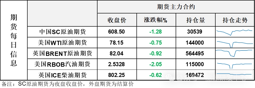 【1】WTI主力原油期貨收跌0.59美元,跌幅0.75%,報78.15美元/桶;布倫特主力原油期貨收跌0.76美元,跌幅0.92%,報82.04美元/桶;INE原油期貨收跌1.28%,報608.5元。