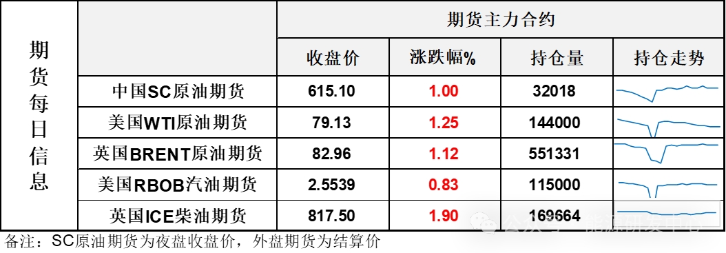 【1】WTI主力原油期貨收漲0.98美元,漲幅1.25%,報(bào)79.13美元/桶;布倫特主力原油期貨收漲0.92美元,漲幅1.12%,報(bào)82.96美元/桶;INE原油期貨收漲1%,報(bào)615.1元。