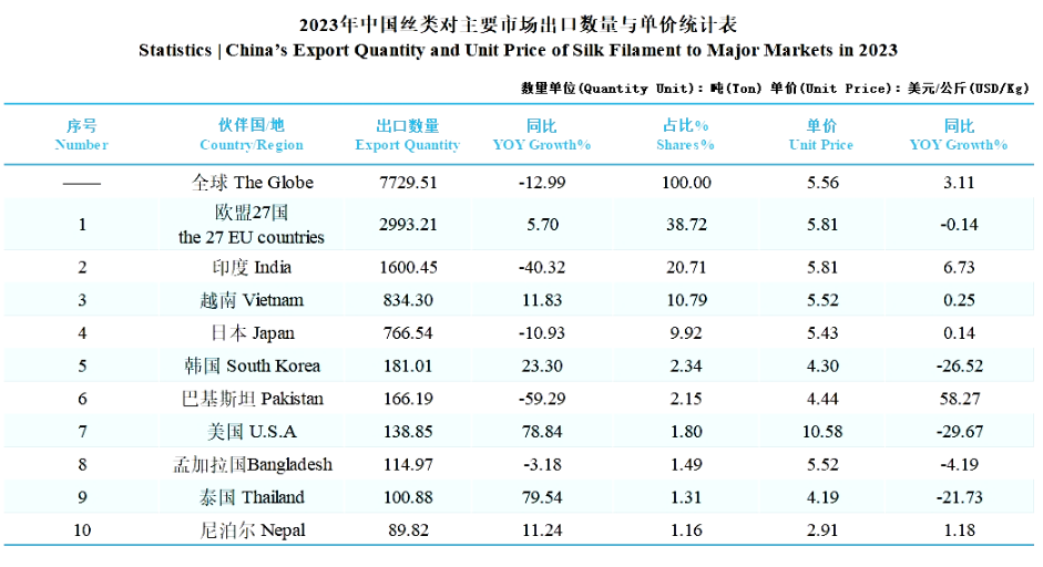 中國 | 2023年中國絲類對主要市場出口情況統(tǒng)計