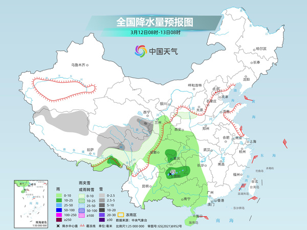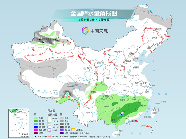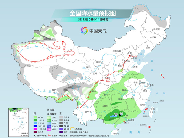 后天,新疆沿天山地區(qū)、西藏東部、青海西部和東南部、川西高原北部等地部分地區(qū)有小到中雪或雨夾雪,其中,新疆沿天山地區(qū)和伊犁河谷、西藏東部等地部分地區(qū)有大雪,局地暴雪(10~15毫米)。江南大部、西南地區(qū)東部、華南大部等地部分地區(qū)有小到中雨,其中,廣西東北部、廣東西北部等地部分地區(qū)有大雨。