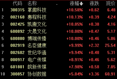 慈文傳媒(8.090, 0.62, 8.30%)、惠程科技(4.240, 0.39, 10.13%)(維權(quán))、大晟文化(5.170, 0.47, 10.00%)、掌趣科技(6.480, 0.62, 10.58%)等多股走強。