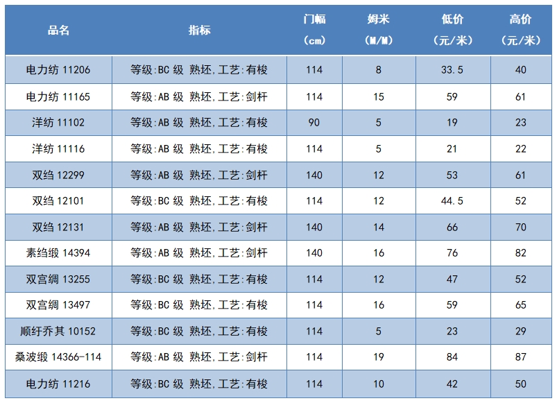 本周綢緞指數(shù)協(xié)作單位成交價(jià)格區(qū)間