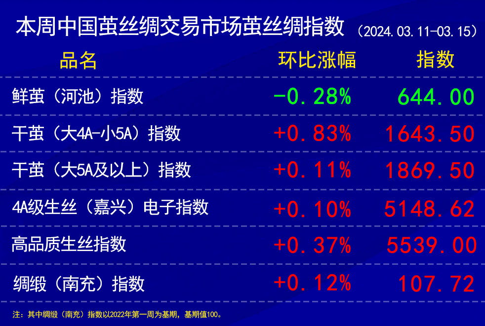 蠶繭指數(shù)上,本周云南等地干繭有小筆數(shù)成交,轉(zhuǎn)換的兩個等級的價(jià)格指數(shù)環(huán)比上周略有收紅。
