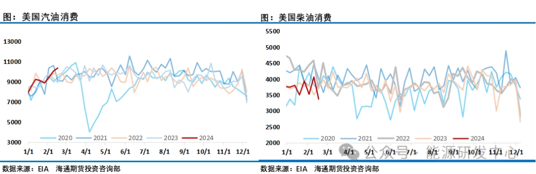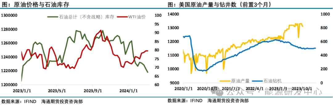 對(duì)于供應(yīng)IEA判斷全球石油供應(yīng)將在2024年增加80萬桶/日,達(dá)到1.029億桶/日。由于歐佩克+減產(chǎn)措施,2024年全年石油市場(chǎng)將面臨供應(yīng)不足。歐佩克+今年晚些時(shí)候似乎還有提高石油產(chǎn)量的空間。如果歐佩克解除減產(chǎn)措施,石油市場(chǎng)可能在下半年出現(xiàn)供應(yīng)過剩。俄羅斯2月原油產(chǎn)量增加2萬桶/日至942萬桶。OPEC公布最新月度原油市場(chǎng)報(bào)告。月報(bào)顯示,盡管歐佩克+實(shí)施新的自愿減產(chǎn)措施,但由利比亞和尼日利亞帶動(dòng),原油產(chǎn)量在2月份增加了20.3萬桶/日,達(dá)到2657萬桶/日。而EIA短期能源展望中預(yù)計(jì)2024年美國(guó)原油產(chǎn)量將增加26萬桶/日,此前預(yù)期為增加17萬桶/日。預(yù)計(jì)2025年美國(guó)原油產(chǎn)量將增加46萬桶/日,此前為增加39萬桶/日。預(yù)計(jì)2024年美國(guó)原油產(chǎn)量為1319萬桶/日,此前預(yù)期為1310萬桶/日。預(yù)計(jì)2025年美國(guó)原油產(chǎn)量為1365萬桶/日,此前預(yù)期為1349萬桶/日。不過最近EIA周度數(shù)據(jù)顯示近期美國(guó)原油產(chǎn)量連續(xù)第二周下滑10萬桶/日,目前只有1310萬桶/日。