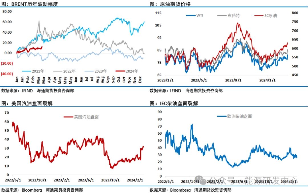 周五歐美油價(jià)微跌,比較大的變化是隨著SC原油(629, 2.30, 0.37%)近月合約隨著合約換月和臨近自然人最后持倉(cāng)日資金退出油價(jià)退燒明顯,周五出現(xiàn)大幅回落,SC原油與歐美油價(jià)跨區(qū)價(jià)差收縮2美元。過去一周全球各區(qū)域油價(jià)紛紛刷新了年內(nèi)高點(diǎn),WTI和布倫特原油先后突破了80美元、85美元關(guān)口,SC原油近月合約更是一度越過了650元關(guān)口。在3月12-14日三大機(jī)構(gòu)公布月報(bào)這個(gè)時(shí)間窗口,油價(jià)借利多消息集中發(fā)力突破了過去幾周來的窄幅震蕩區(qū)間。盡管市場(chǎng)上對(duì)歐佩克+減產(chǎn)執(zhí)行力度有不同聲音,但從各機(jī)構(gòu)3月月報(bào)觀點(diǎn)的調(diào)整可以看出歐佩克+減產(chǎn)對(duì)原油市場(chǎng)供需平衡的影響還是非常明顯,核心機(jī)構(gòu)普遍基于歐佩克+減產(chǎn)帶來的影響調(diào)整了對(duì)油市預(yù)期,IEA稱由于歐佩克+減產(chǎn)措施,2024年全年石油市場(chǎng)將面臨供應(yīng)不足。而稍早公布的EIA短期能源展望報(bào)告更是大幅上調(diào)了油價(jià)預(yù)期,預(yù)計(jì)2024年WTI原油價(jià)格為82.15美元/桶,此前預(yù)期為77.68美元/桶;預(yù)計(jì)2024年布倫特原油價(jià)格為87美元/桶,此前預(yù)期為82.42美元/桶。