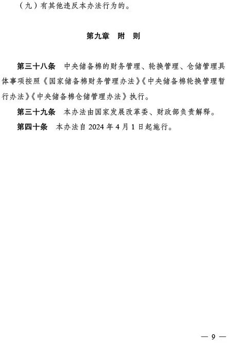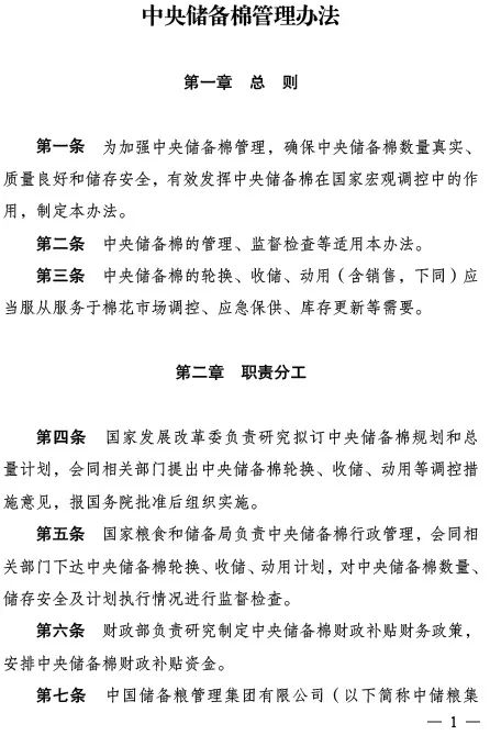 日前,國家發(fā)展改革委、財(cái)政部聯(lián)合印發(fā)《中央儲(chǔ)備棉管理辦法》(以下簡稱《辦法》),該《辦法》是為了貫徹落實(shí)黨中央、國務(wù)院關(guān)于加強(qiáng)儲(chǔ)備體系建設(shè)的決策部署,進(jìn)一步強(qiáng)化中央儲(chǔ)備棉管理,更好發(fā)揮中央儲(chǔ)備棉在宏觀調(diào)控中的作用。自2024年4月1日起《辦法》正式施行。