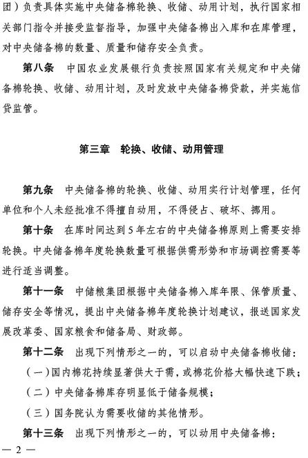 一是服務(wù)宏觀調(diào)控。堅(jiān)持中央儲(chǔ)備棉輪換、收儲(chǔ)、動(dòng)用(含銷售,下同)應(yīng)當(dāng)服從服務(wù)于棉花市場調(diào)控、應(yīng)急保供、庫存更新等需要的總要求,明確啟動(dòng)中央儲(chǔ)備棉輪換、收儲(chǔ)、動(dòng)用的具體情形。