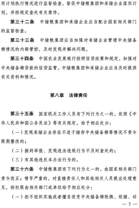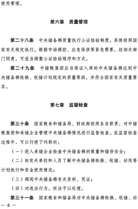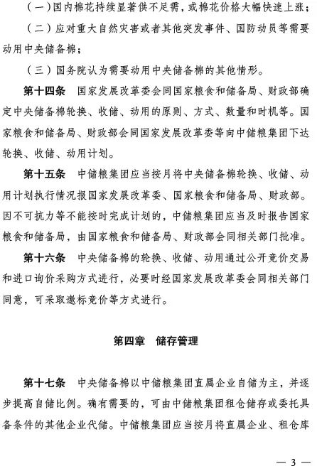 二是明確職責(zé)程序。界定國家發(fā)展改革委、國家糧食和儲(chǔ)備局、財(cái)政部等部門和單位在中央儲(chǔ)備棉管理中的職責(zé),并規(guī)定了中央儲(chǔ)備棉計(jì)劃下達(dá)程序、執(zhí)行報(bào)告要求和操作方式等。