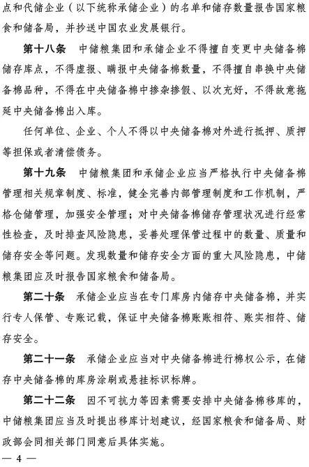 三是加強(qiáng)儲(chǔ)存管理。要求中儲(chǔ)糧集團(tuán)和承儲(chǔ)企業(yè)加強(qiáng)內(nèi)部管控、實(shí)行專庫專人專賬管理等,確保入庫儲(chǔ)備棉質(zhì)量,明令不得擅自變更庫點(diǎn)和串換品種、不得摻雜摻假和以次充好、不得故意拖延出入庫、不得以中央儲(chǔ)備棉對(duì)外擔(dān)?;蚯鍍攤鶆?wù)等。