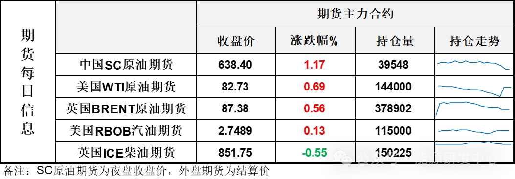 【1】WTI主力原油(638, 6.60, 1.05%)期貨收漲0.57美元,漲幅0.69%,報(bào)82.73美元/桶;布倫特主力原油期貨收漲0.49美元,漲幅0.56%,報(bào)87.38美元/桶;INE原油期貨收漲1.17%,報(bào)638.4元。