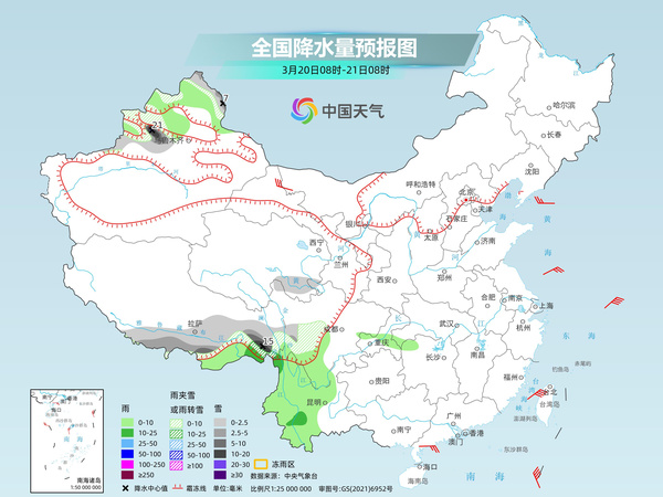 后天,內(nèi)蒙古東北部、黑龍江東南部、吉林東部、新疆北部和南疆西部山區(qū)高海拔地區(qū)、西藏北部和東南部、青海西部等地部分地區(qū)有小到中雪或雨夾雪,其中,吉林東部、新疆北疆北部等地部分地區(qū)有大雪,局地暴雪。內(nèi)蒙古東南部、黑龍江南部、吉林中西部、遼寧中東部、西藏東南部、云南西部和南部、河南中南部、安徽大部、江蘇中南部、湖北大部、江西中北部、湖南北部和東部、重慶、四川東部、貴州北部和東南部、廣西中西部、廣東北部等地部分地區(qū)有小到中雨,其中,遼寧東部、河南南部、安徽北部、湖南西部等地局地有大雨。