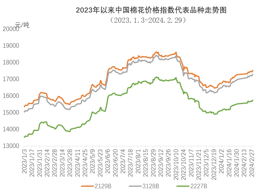 2月,中國(guó)棉花價(jià)格指數(shù)(CCIndex3128B)持續(xù)上漲。月內(nèi)受春節(jié)假期影響,新棉加工增速大幅放緩,月中企業(yè)陸續(xù)放假,補(bǔ)庫(kù)意愿降低,市場(chǎng)交投氛圍冷清;春節(jié)后棉花企業(yè)銷(xiāo)售積極性較高,但由于紡織企業(yè)節(jié)前補(bǔ)庫(kù),原料庫(kù)存基本充足,紡織企業(yè)新增訂單較少,現(xiàn)貨成交情況一般?,F(xiàn)貨價(jià)格隨期貨走高,但國(guó)外棉價(jià)漲幅大于國(guó)內(nèi)棉價(jià),內(nèi)外棉價(jià)差逐漸倒掛,部分企業(yè)增加新疆棉使用占比。2月29日,中國(guó)棉花價(jià)格指數(shù)(CCIndex3128B)收于17295元/噸,環(huán)比上漲300元;月均價(jià)為17107元/噸,環(huán)比上漲417元,同比上漲1395元。