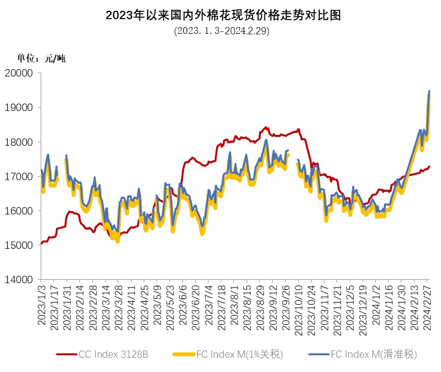 2月,受春節(jié)假期因素影響,皮棉銷(xiāo)售緩慢,紡織企業(yè)新增訂單較少,對(duì)原料采購(gòu)較為謹(jǐn)慎。國(guó)內(nèi)棉價(jià)格在國(guó)際價(jià)格影響下持續(xù)上漲,29日中國(guó)棉花價(jià)格指數(shù)(CCIndex3128B)收于近4個(gè)月最高點(diǎn),為17295元/噸。國(guó)際市場(chǎng),由于美棉供應(yīng)偏緊及外圍能源市場(chǎng)上漲,國(guó)際棉價(jià)持續(xù)上行,ICE期棉突破100美分/磅,月底漲至自2022年9月以來(lái)高點(diǎn)103.8美分/磅。外棉漲幅高于國(guó)內(nèi),內(nèi)外棉價(jià)差再次出現(xiàn)倒掛。