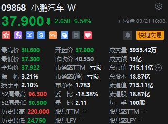 小鵬汽車挫逾6%。消息面上,當(dāng)?shù)貢r(shí)間3月20日,小鵬汽車在美國(guó)證券交易委員會(huì)提交的文件顯示,阿里巴巴旗下淘寶中國(guó)控股有限公司(Taobao China Holding Limited)計(jì)劃出售3300萬(wàn)份小鵬汽車ADS,總價(jià)值約3.14億美元(約22.61億元人民幣)。這并不是阿里首次減持小鵬。去年12月,阿里曾出售小鵬汽車2500萬(wàn)份ADS,總價(jià)值約3.91億美元(約27.68億元人民幣)。兩次出售的ADS均為2019年9月12日作為IPO前投資所購(gòu)得的。