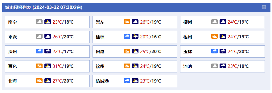 南寧市:今天白天陰天、局地有小雨,今天晚上陰天到多云,南風2~3級,最高氣溫23℃,最低氣溫18℃。