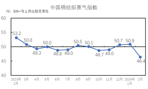 2月份,中國棉紡織景氣指數(shù)為46.4%,較1月下降4.5個百分點。國家統(tǒng)計局發(fā)布的2024年1月中國制造業(yè)采購經(jīng)理指數(shù)為49.1%,較1月下降0.1個百分點。2月份,由于春節(jié)假日因素影響,制造業(yè)處于傳統(tǒng)生產(chǎn)淡季,加之疫情防控平穩(wěn)轉(zhuǎn)段后企業(yè)員工假期返鄉(xiāng)增多,企業(yè)生產(chǎn)經(jīng)營受到較大影響,制造業(yè)市場活躍度總體有所下降。