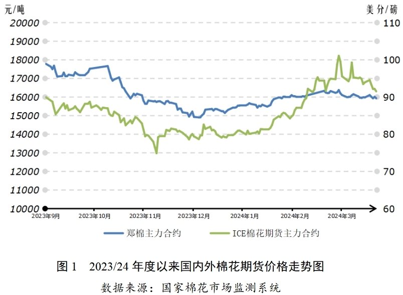 2023/24年度國際棉花供需充裕狀況有所收緊,終端服裝市場去庫仍較緩慢。2月底以來ICE期價(jià)大漲后回調(diào),暫時(shí)處于盤整狀態(tài)。