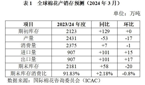 3月,據(jù)國際棉花咨詢委員會(huì)(ICAC)預(yù)測,2023/24年度全球棉花產(chǎn)量2431萬噸,環(huán)比調(diào)減17萬噸;棉花消費(fèi)量2375萬噸,環(huán)比調(diào)減1萬噸;期末庫存2181萬噸,環(huán)比調(diào)減20萬噸;棉花庫存消費(fèi)比91.83%,環(huán)比調(diào)減0.8個(gè)百分點(diǎn)。其中調(diào)增中國消費(fèi)量30萬噸、進(jìn)口量25萬噸,調(diào)增巴西、美國出口量21萬噸、4萬噸。