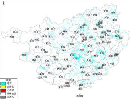 圖1 廣西未來七天水稻春播氣象適宜性分布圖