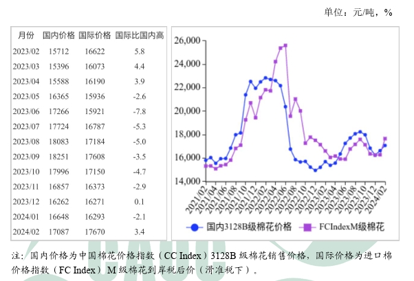 (二)國際棉價環(huán)比上漲。美國棉花加工基本結(jié)束,印度籽棉交售進(jìn)入尾聲,國際棉花市場供應(yīng)逐步減少;全球消費(fèi)需求有所回暖,紡織業(yè)呈現(xiàn)一定改善跡象,加之美國農(nóng)業(yè)部2月報告調(diào)減全球產(chǎn)量和庫存,國際棉價較快上漲。據(jù)USDA統(tǒng)計(jì),截至2月15日,美國累計(jì)凈簽約出口2023/24年度棉花241.54萬噸,達(dá)年度預(yù)期出口量的89.9%,出口進(jìn)度表現(xiàn)良好。2月份,Cotlook A指數(shù)(相當(dāng)于國內(nèi)3128B級棉花)月均價每磅98.78美分,環(huán)比漲7.5%,同比跌0.6%。