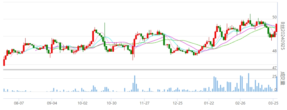 今日(2024年03月27日,周三)中國繭絲綢交易市場(chǎng)生絲指數(shù)上漲0.31%收于4978.02點(diǎn)。B絲(商檢4A級(jí)生絲):240425合約報(bào)平收于49.59萬元;240925合約上漲0.45萬元報(bào)收于49.71萬元;250325合約上漲0.72萬元報(bào)收于50.07萬元。