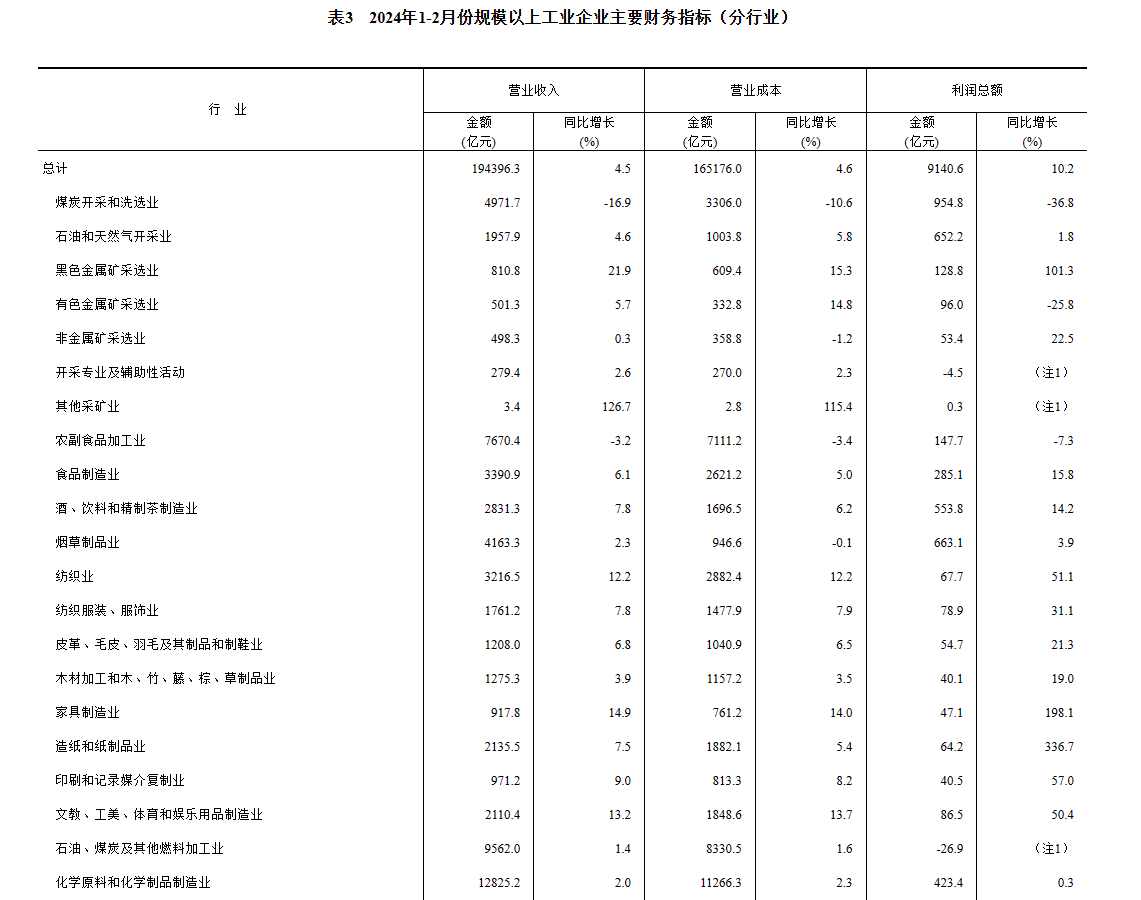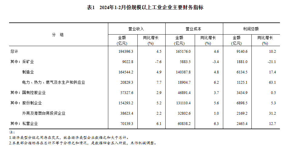 1—2月份,全國規(guī)模以上工業(yè)企業(yè)實現(xiàn)利潤總額9140.6億元,同比增長10.2%(按可比口徑計算,詳見附注二)。