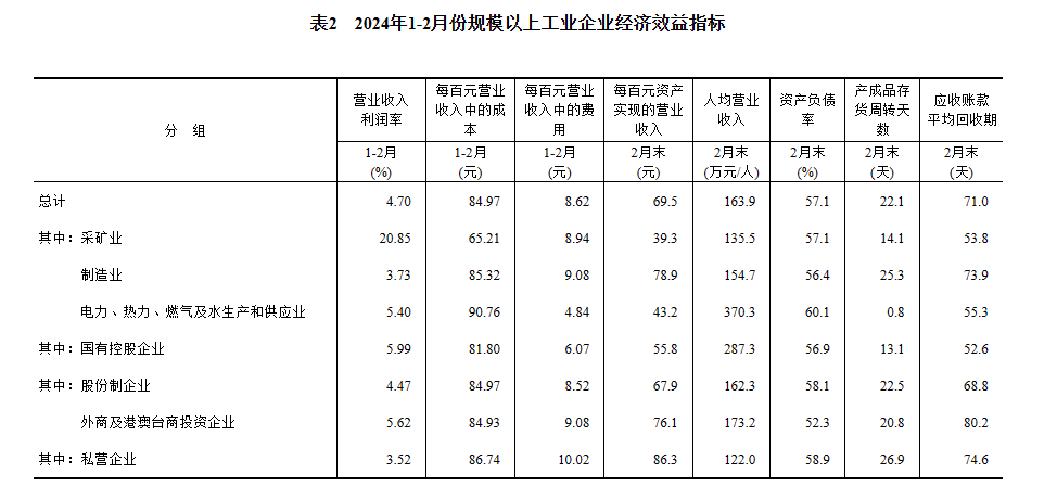 1—2月份,規(guī)模以上工業(yè)企業(yè)實現(xiàn)營業(yè)收入19.44萬億元,同比增長4.5%;發(fā)生營業(yè)成本16.52萬億元,增長4.6%;營業(yè)收入利潤率為4.70%,同比提高0.24個百分點。