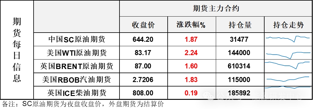【1】WTI主力原油期貨收漲1.82美元,漲幅2.24%,報(bào)83.17美元/桶;布倫特主力原油期貨收漲1.37美元,漲幅1.6%,報(bào)87美元/桶;INE原油期貨收漲1.87%,報(bào)644.2元。