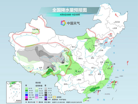 預(yù)計今天(4月8日),江南、華南等地降雨將明顯減少減弱,迎來降雨間歇期。但在青藏高原中東部,未來三天仍將出現(xiàn)持續(xù)性雨雪天氣。此外,今明兩天,東北、華北等地在冷空氣以及降水的影響下,氣溫將普遍下降。冷空氣過后,上述地區(qū)氣溫又會快速回升。