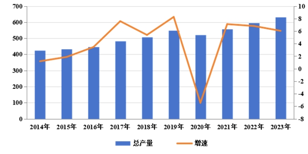 圖3 2014~2023年中國化纖長絲織物產(chǎn)量(億米)及增速(%)