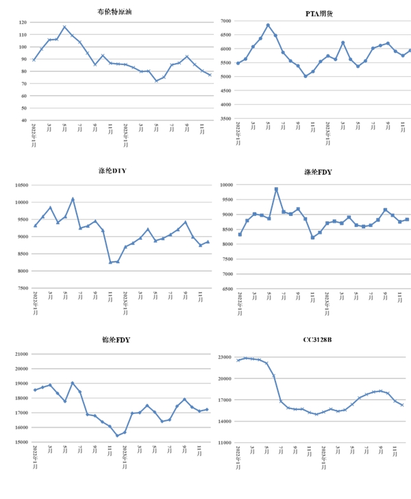 圖4 2022年1月~2023年12月我國化纖長絲、棉花、PTA期貨及布倫特原油價(jià)格走勢(shì)