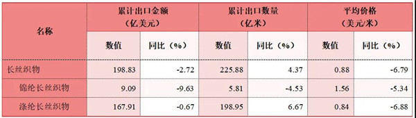 中國海關(guān)數(shù)據(jù)顯示,2023年,我國化纖長絲織物累計(jì)進(jìn)口9.3億美元,同比下降14.9%;累計(jì)進(jìn)口數(shù)量為3.7億米,同比下降11.9%;進(jìn)口平均價(jià)格為2.3美元/米,同比下降3.5%。