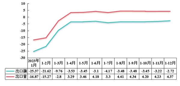 圖5 2023年我國長絲織物累計(jì)出口金額、出口數(shù)量增速(%)